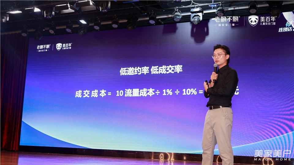 在流量获客上,总经理赖锦良围绕当下连锁店正面临严峻的市场考验,作了《门窗店,生存发展核心能力之流量获客》主题演讲,分享:获客能力、成交能力、服务能力将是门窗店未来生存核心能力,并围绕流量、获客、转化成本等提出了:总部负责“给流量、给爆款、给方法”,连锁店负责:“提邀约率、提成交率、提展厅形象”的解决方案。
