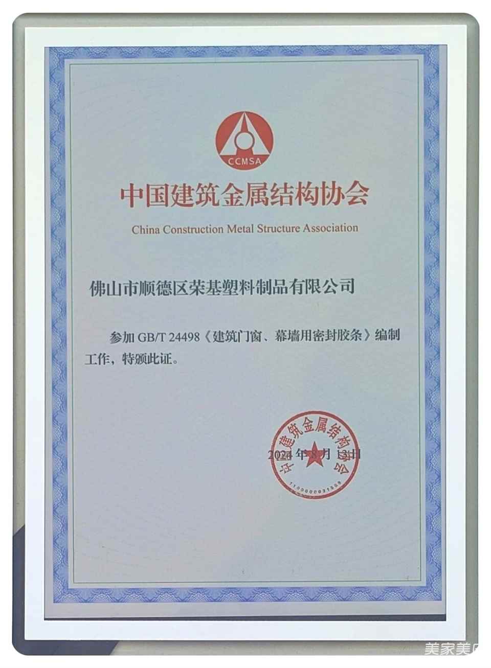 嘉奖!荣基获颁《建筑门窗、幕墙用密封胶条》国家标准参编单位证书