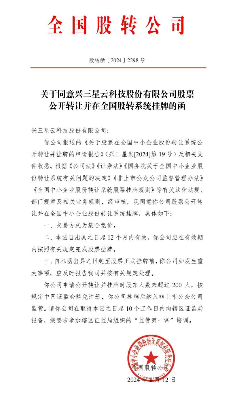 2024年9月24日,兴三星云科技股份有限公司(证券简称:兴三星,证券代码:874523)在全国中小企业股份转让系统成功挂牌!