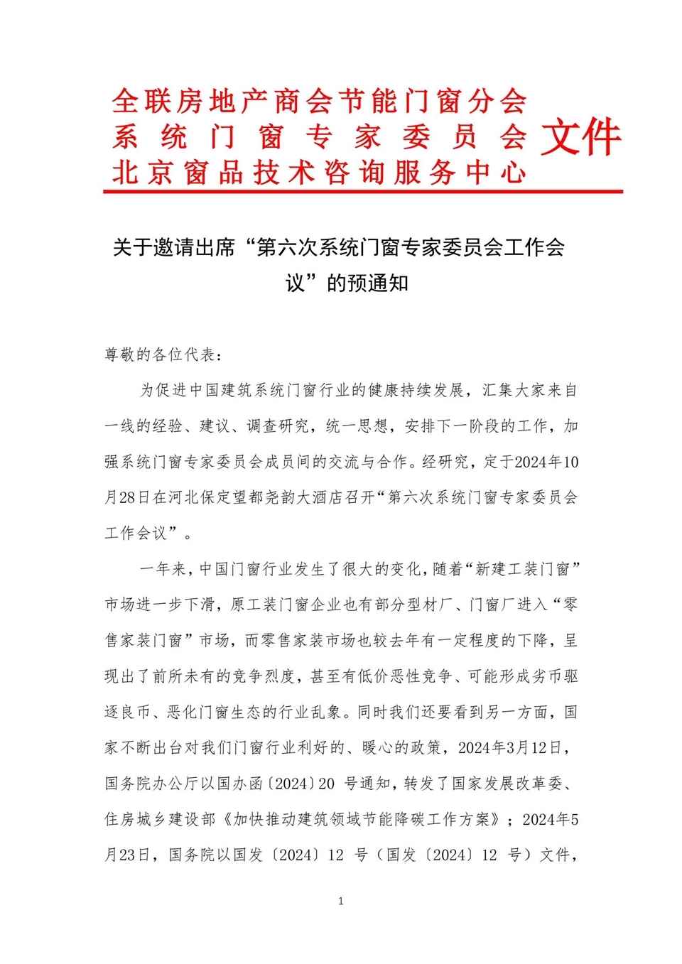 关于邀请出席“第六次系统门窗专家委员会工作会议”的预通知