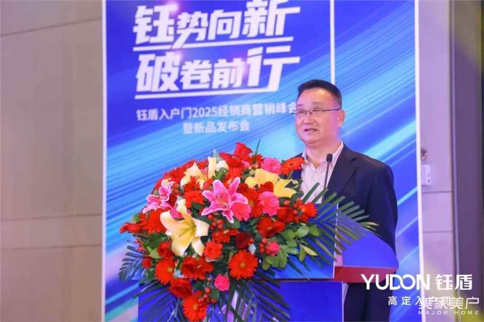 随后,广东省门业协会执行会长徐生发表致辞。他表示,尽管当前家居行业面临挑战,但2025年中国入户门市场预计将迎来爆发式增长,行业发展前景广阔。他对以钰盾为代表的深耕入户门行业的企业致以崇高敬意,并特别提到在贺董的带领下,钰盾始终紧跟市场趋势,不断提升产品竞争力。作为协会副会长单位,钰盾注重品牌建设与产品创新,已成为广东安全门行业的标杆企业。徐会长强调,钰盾凭借对市场需求的精准把握和持续创新,未来必将走在全国入户门行业前列,为行业发展树立典范。