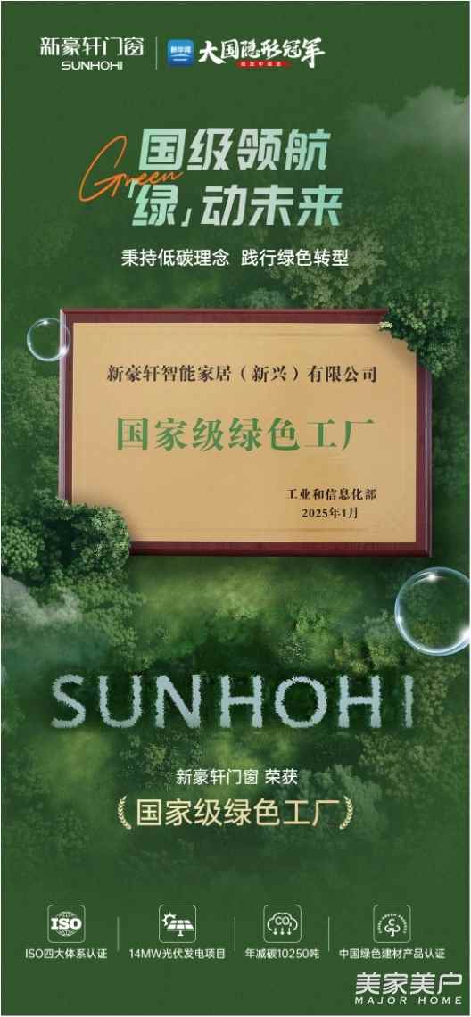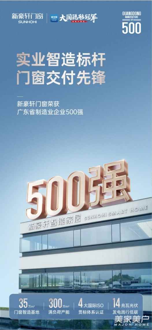 作为国家级绿色工厂单位,新豪轩门窗始终恪守"高端化、智能化、绿色化"发展理念,通过全链路绿色智造体系引领行业转型升级。新豪轩是首家入选新华网《极致中国造—大国隐形冠军》的企业,每年为超过100000户家庭提供全屋门窗一站式解决方案的。此外,新豪轩还成功跻身"广东省制造业企业500强"榜单,实现了国家战略认可与市场价值验证的双重突破。