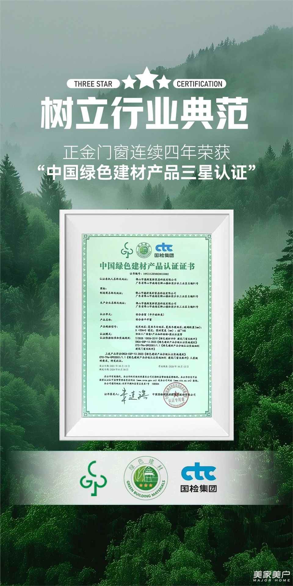 在品牌价值构建的过程中,正金门窗以品质与创新为导向,引导产品与品牌呈螺旋式上升发展,激发行业的创新变革。全品类产品连续四年荣获“中国绿色建材产品认证”,引领行业健康绿色发展。