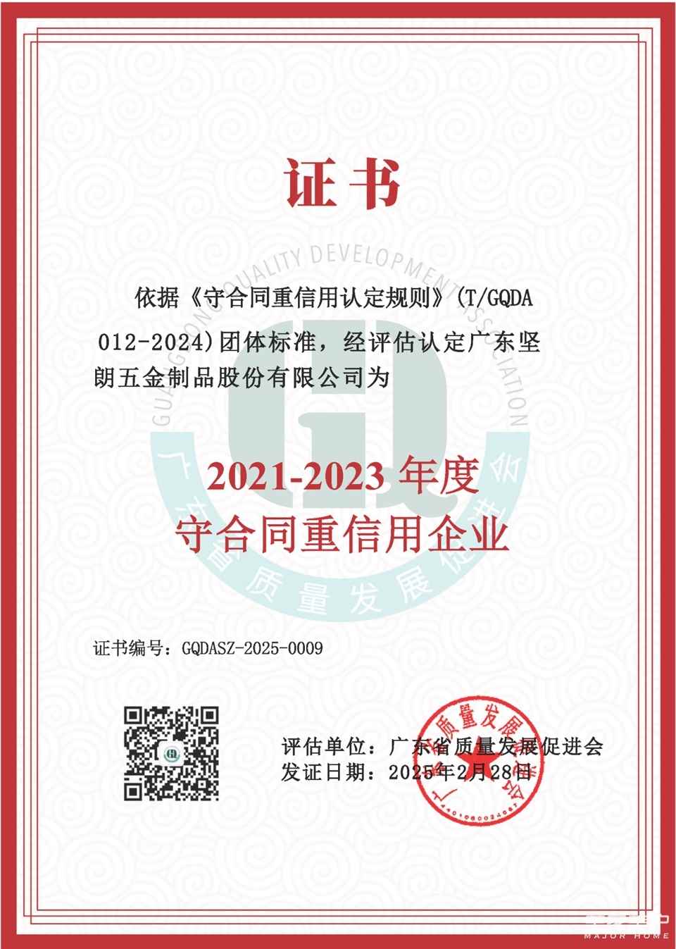 近日,广东省质量发展促进会正式发布2021-2023年度“守合同重信用企业”评选结果,坚朗再次被授予“广东省守合同重信用企业”称号。