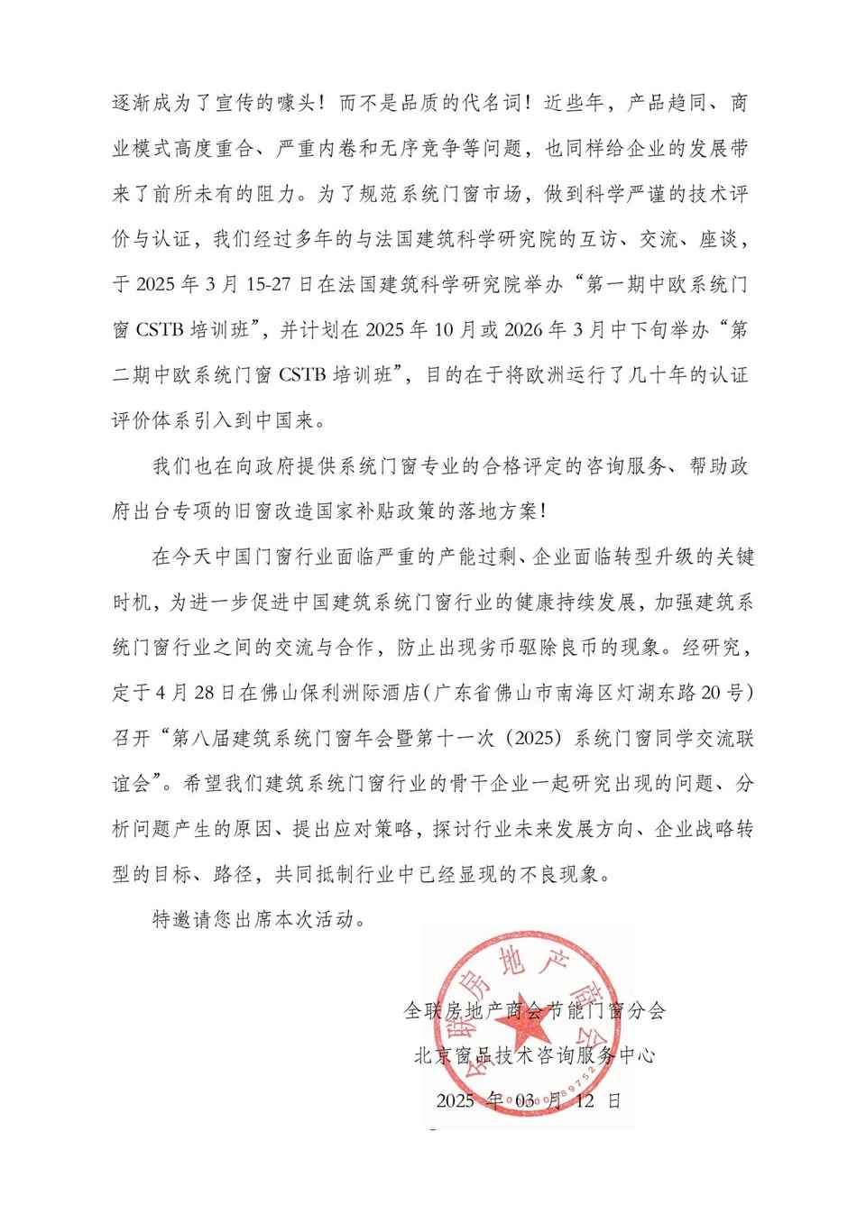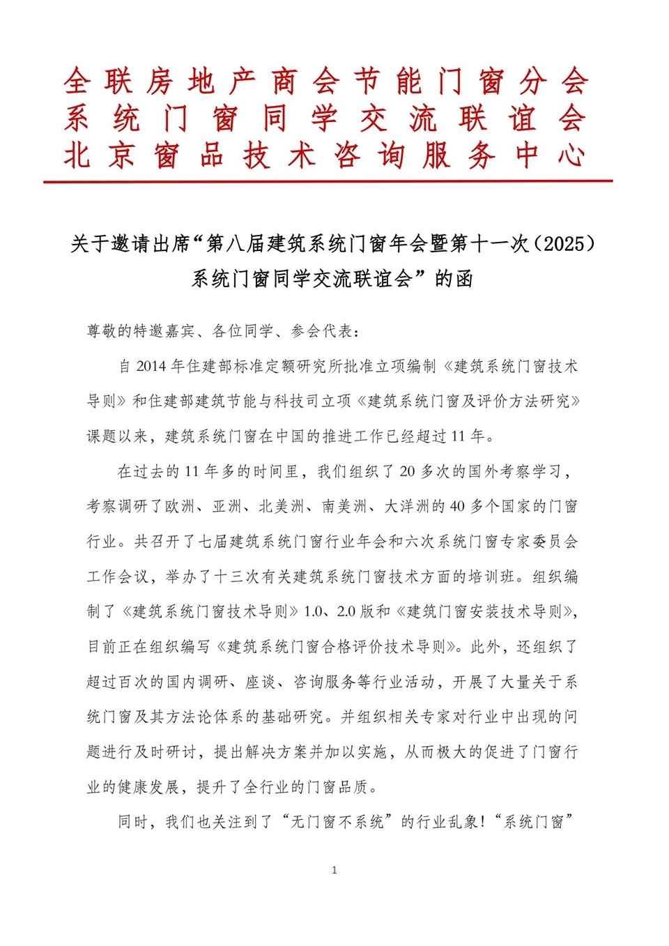 关于邀请出席“第八届建筑系统门窗年会暨第十一次(2025) 系统门窗同学交流联谊会”的函