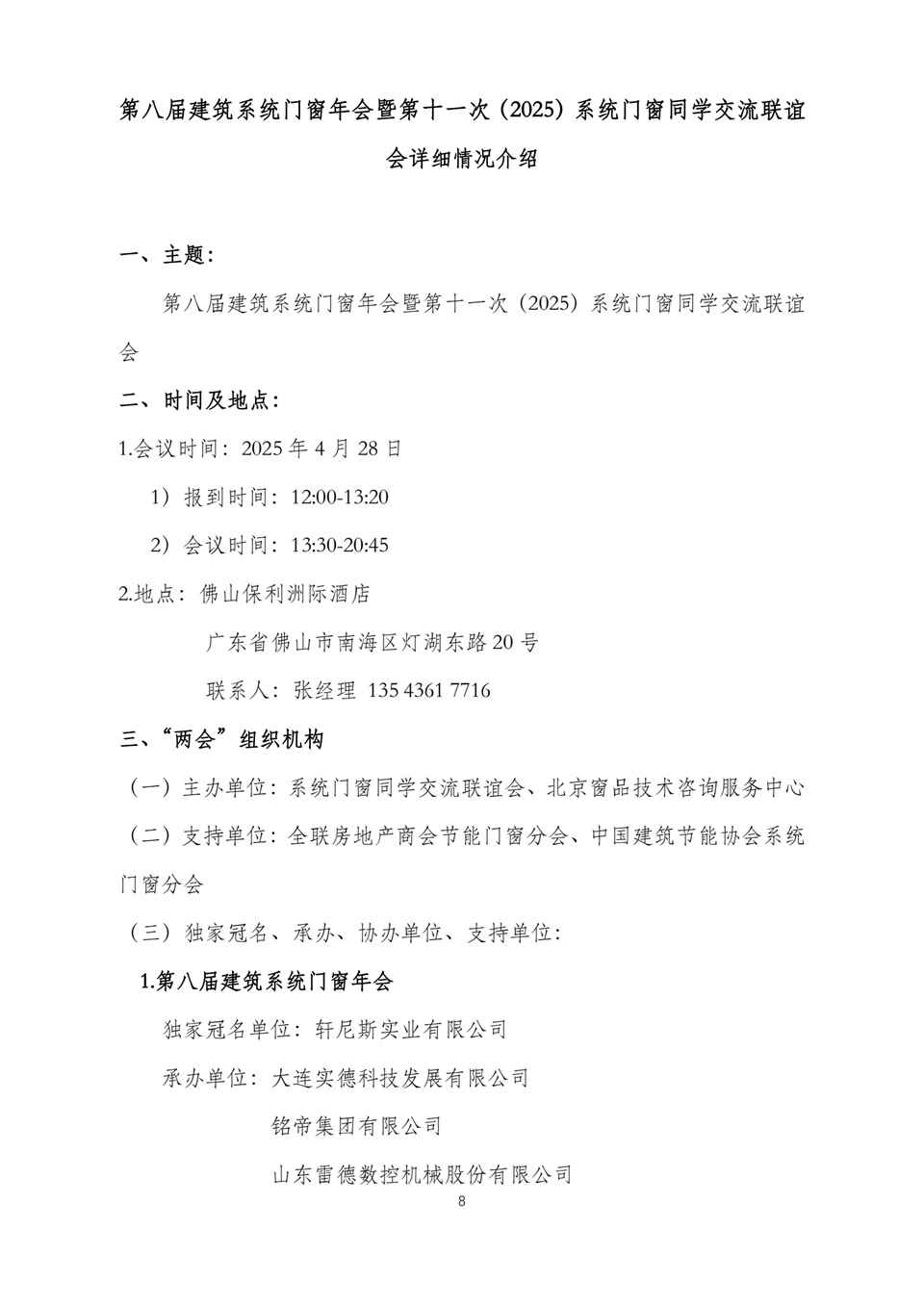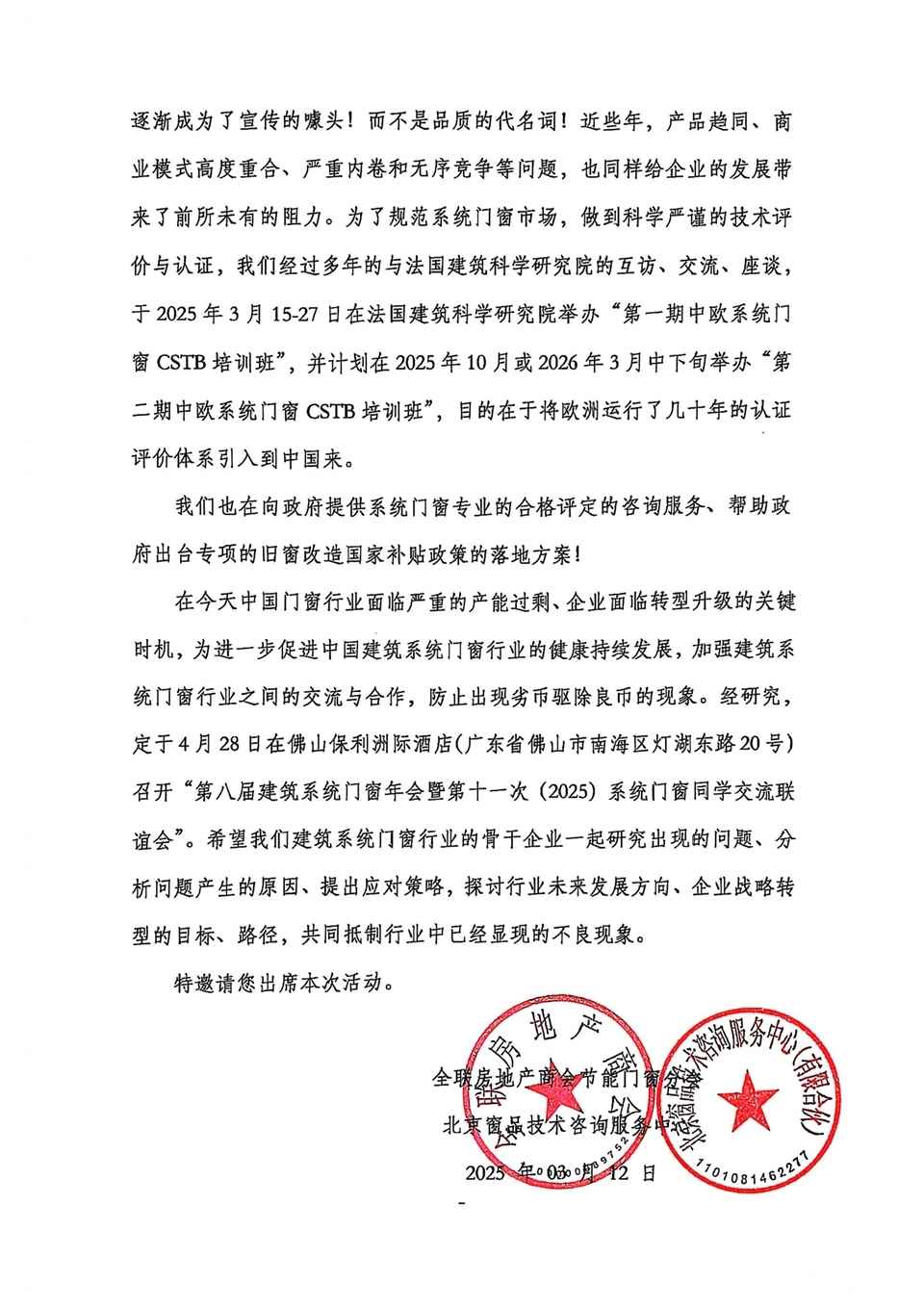 关于邀请出席“第八届建筑系统门窗年会暨第十一次(2025) 系统门窗同学交流联谊会”的函