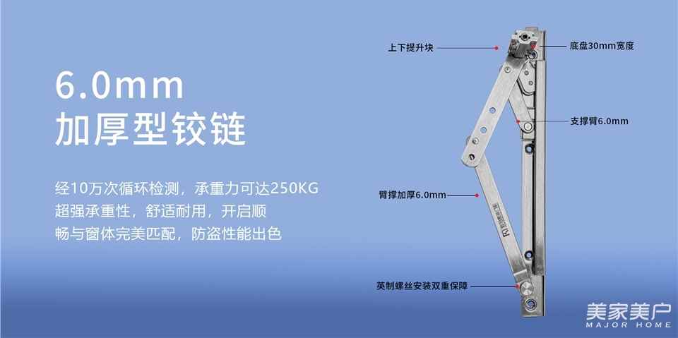 3、6.0mm的加厚型承重铰链:采用独自研发的6.0mm加厚型承重铰链,承重力可达250KG,使用寿命更是超20万次的启闭测试。在台风频发地区,这项技术成功抵御超13级强风冲击,成为大部分家庭信赖的安全卫士。更有创新性的室内安装方式,杜绝了传统外装铰链的老化隐患,使用寿命延长至30年以上。