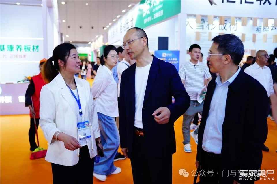 在锦华板材展位,锦华板材董事长王魁向周小军一行介绍了本次参加展会的产品特点。周小军表示,好的产品一定要大力向外推广,无论是软件实力,还是硬件设施,一定要做到真诚服务、诚信经营。周小军再次强调,供应链板块是下游生产企业的紧密战友,是生产环节的重中之重,一定要循序渐进的引导生产企业朝着高质量、高效益的方向发展,成为生产企业的良师益友。
