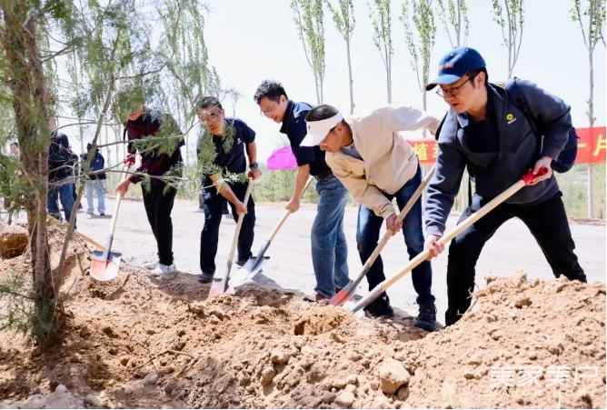 随后,大家挥锹培土,栽下首批新绿。风沙拂过新土,绿叶摇曳成诗,在时光的长卷中绵延青绿。沙漠之上,责任与希望同频共振。