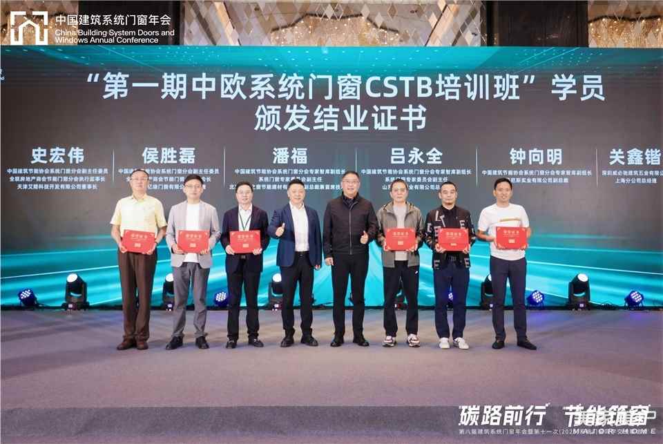 全联房地产商会副秘书长、中国建筑节能协会系统门窗分会顾问团组长边东昱,全联房地产商会节能门窗分会名誉会长、中国建筑节能协会系统门窗分会名誉主任委员,北京米兰之窗节能建材有限公司董事长马俊清上台为中国建筑节能协会系统门窗分会副主任委员、全联房地产商会节能门窗分会执行监事长、天津艾隆科技开发有限公司董事长史宏伟,中国建筑节能协会系统门窗分会副主任委员、全联房地产商会节能门窗分会副会长、山东佰亿缘门窗有限公司总经理侯胜磊,中国建筑节能协会系统门窗分会专家智库副组长、系统门窗专家委员会副主任、北京米兰之窗节能建材有限公司副总裁兼首席技术官潘福,中国建筑节能协会系统门窗分会专家智库副组长、系统门窗专家委员会副主任、山东青建铝业有限公司总经理吕永全,中国建筑节能协会系统门窗分会专家智库副组长、轩尼斯实业有限公司副总裁钟向明,深圳威必驰建筑五金有限公司上海分公司总经理关鑫锴六位学员颁发了“CSTB系统门窗认证培训一期结业证书”。