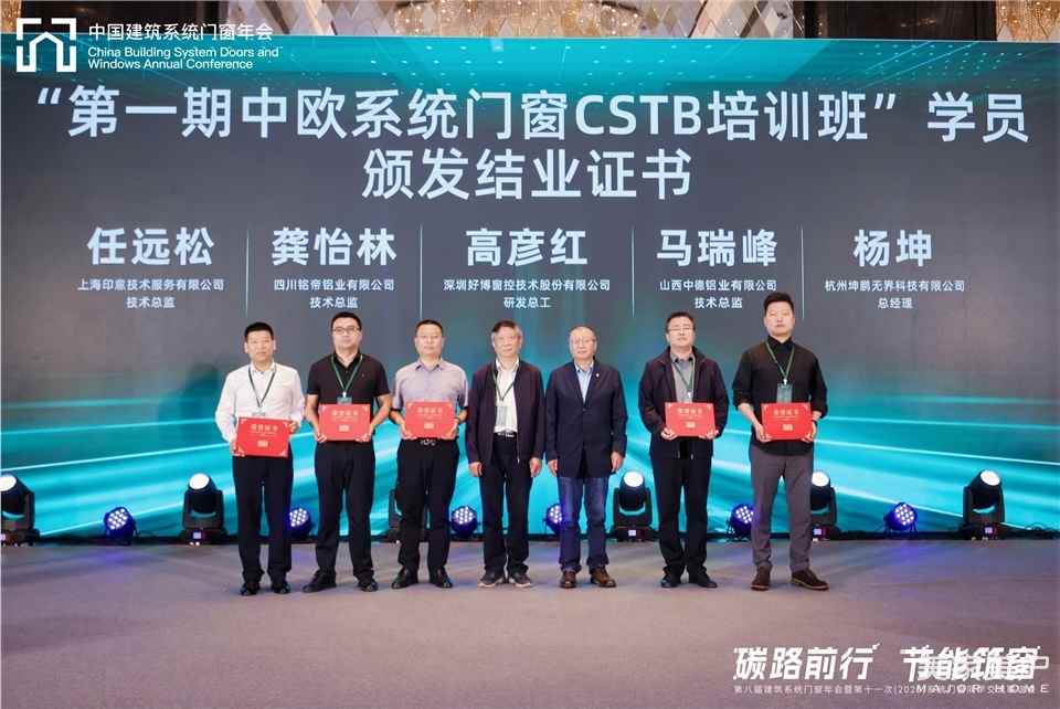 全联房地产商会副秘书长,写字楼分会执行会长刘凯,中国建筑节能协会系统门窗分会顾问团名誉组长、系统门窗专家委员会名誉主任、上海市建筑五金门窗行业协会常务副会长兼秘书长钱经纬上台为上海印意技术服务有限公司技术总监任远松、四川铭帝铝业有限公司技术总监龚怡林,深圳好博窗控技术股份有限公司研发总工高彦红,山西中德铝业有限公司技术总监马瑞峰,杭州坤鹏无界科技有限公司总经理杨坤五位学员颁发了“CSTB系统门窗认证培训一期结业证书”。