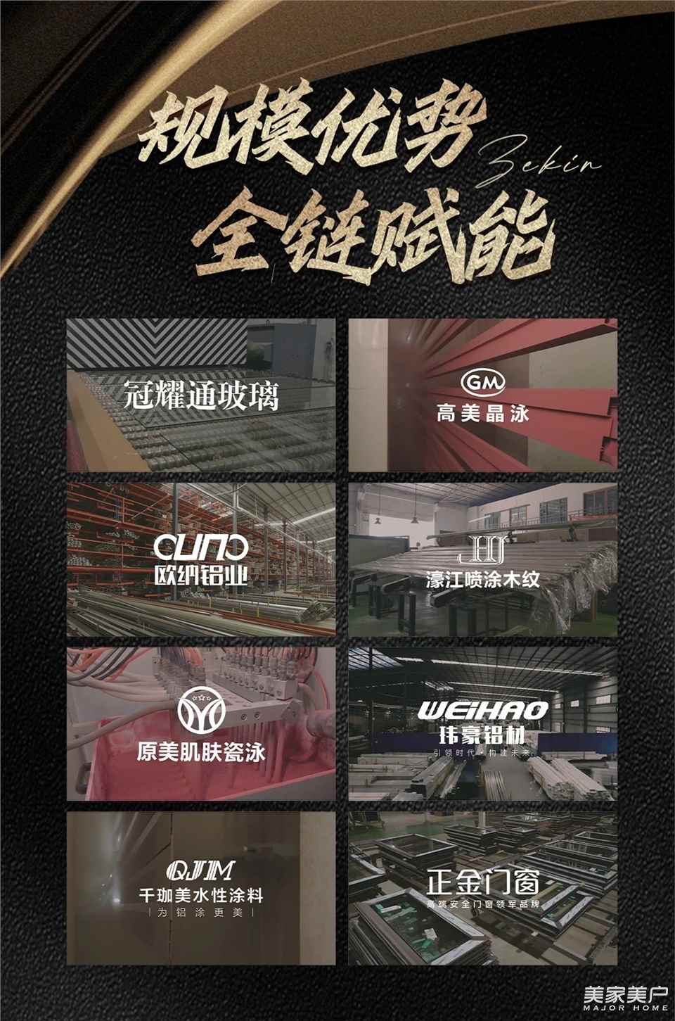 正金门窗深耕行业17年,为构建现代化的全产业链格局和具有竞争力的创新体系,自建上下游生产基地。通过冠耀通玻璃、高美晶泳、欧纳铝业、原美肌肤瓷泳、正金门窗、濠江喷涂木纹、玮豪铝材、千珈美水性涂料等八大高端安全产业链,在面对行业“寒冬潮”时,全产业链协同优势能够让正金门窗拥有超强抗风险能力,为加盟投资保驾护航。