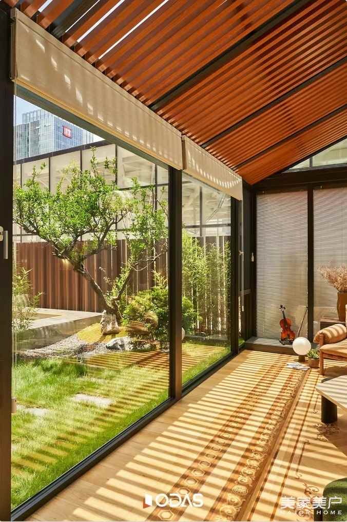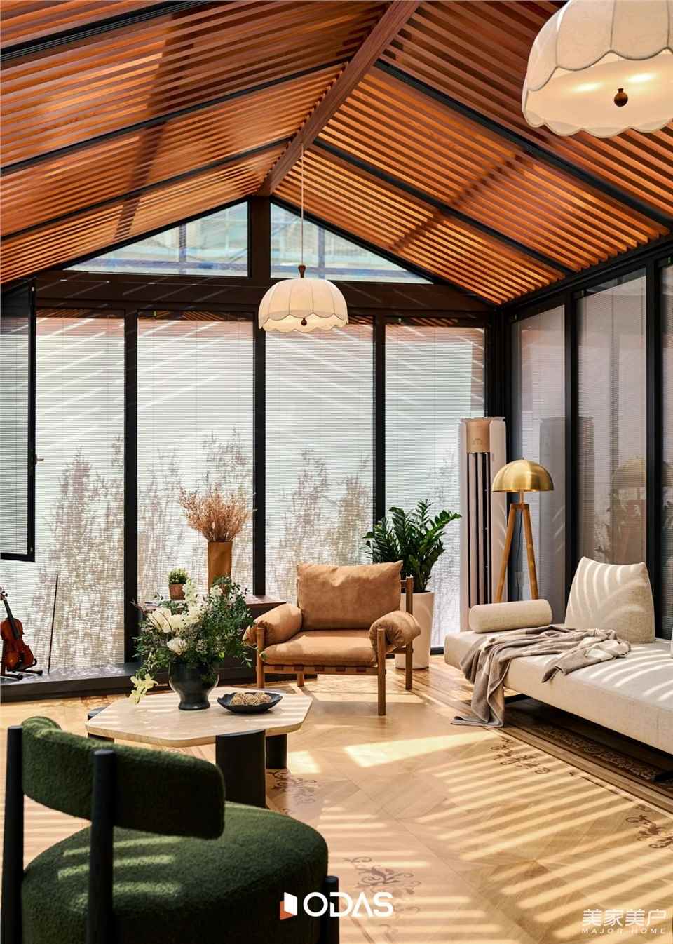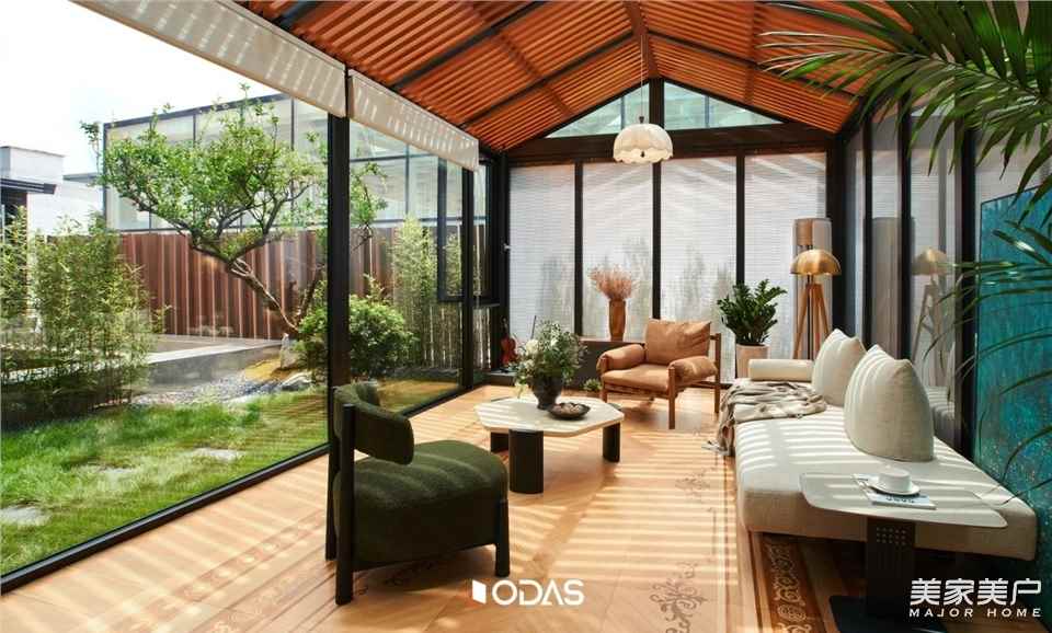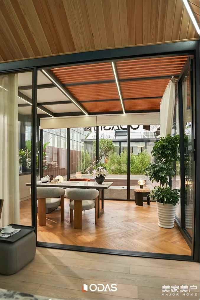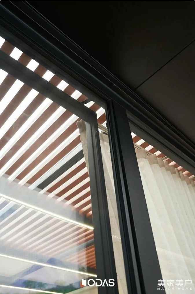 欧大师门窗以“技术美学化、体验情感化”为标杆,将前沿科技与自然场景深度融合。顶面四方天幕的格栅铺设与建筑几何构成相呼应,将光线过滤柔化,引光入室,完成不同场景之间的丰富切换。