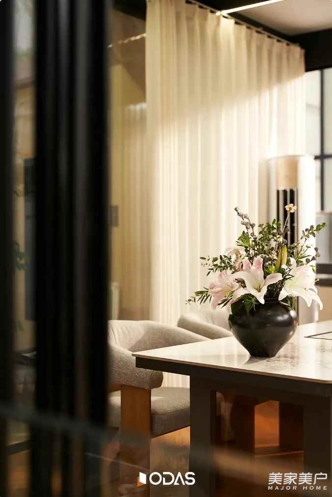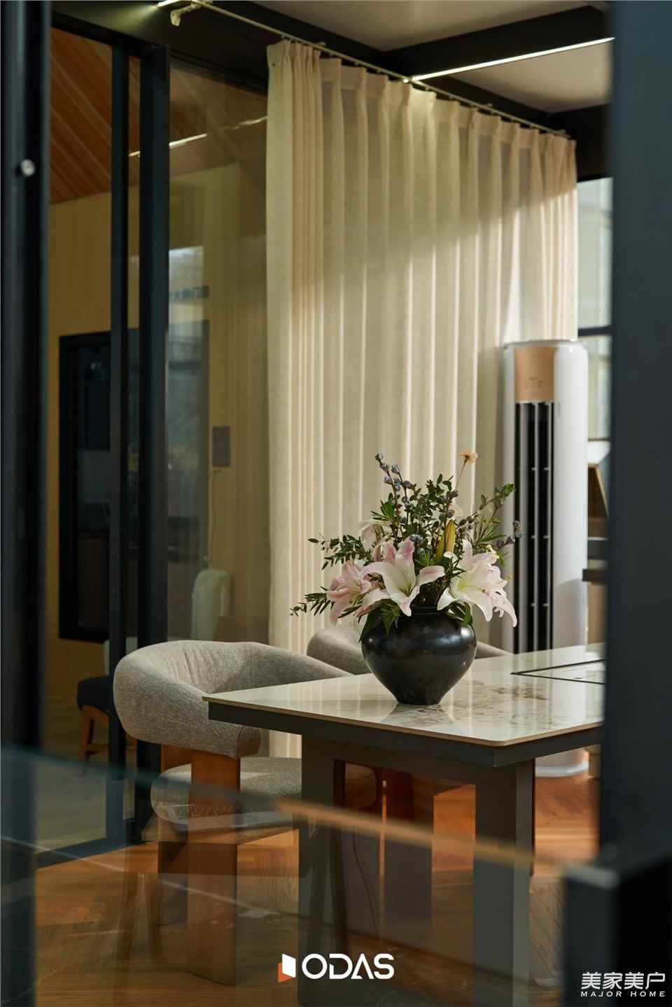 整个展厅设计的底层逻辑之一,便是打破传统门窗品类卖场内展厅的商业氛围,弱化空间的商业属性,于自然中营造松弛氛围。欧大师门窗的品质感与设计感产品属性换化为真实设计语言应用到空间中,多元化的服务、功能及生活场景得以完美呈现。