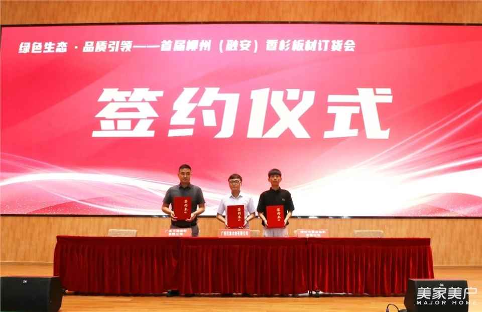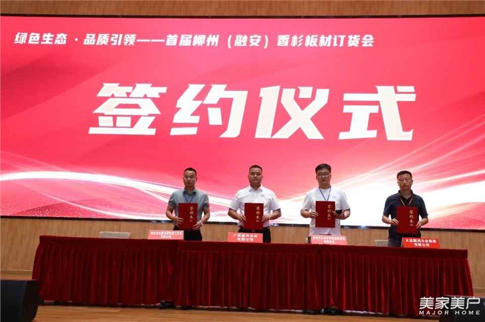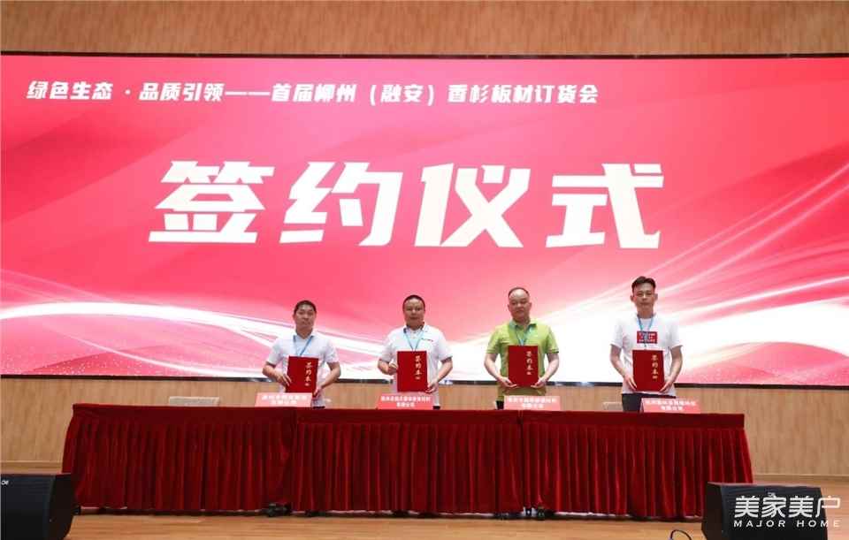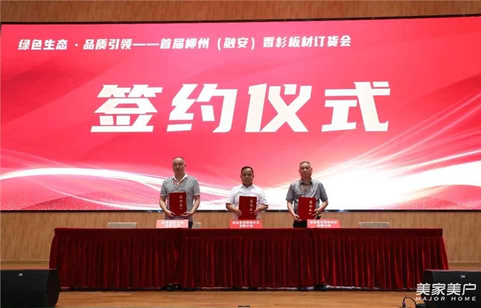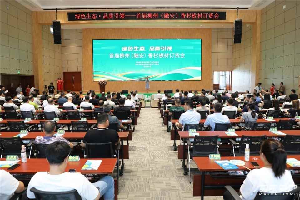 6月29日,首届柳州(融安)香杉板材订货会在广西融安县启幕。千年舟、莫干山等来自全国9省(自治区)20多个地级市的行业专家、企业代表齐聚“中国香杉板材之乡”“中国香杉木生态板之都”,共探绿色家居新机遇,现场签约金额达5.76亿元。柳州市人民政府党组成员袁东升,融安县委书记于福坚,自治区林业局世界林木业邀商邀展组副组长曾昭意,广西林业产业行业协会会长万业靖,柳州市林业和园林局副局长欧日升,融安县委常委、副县长莫慧明,副县长陈远昭等出席活动。