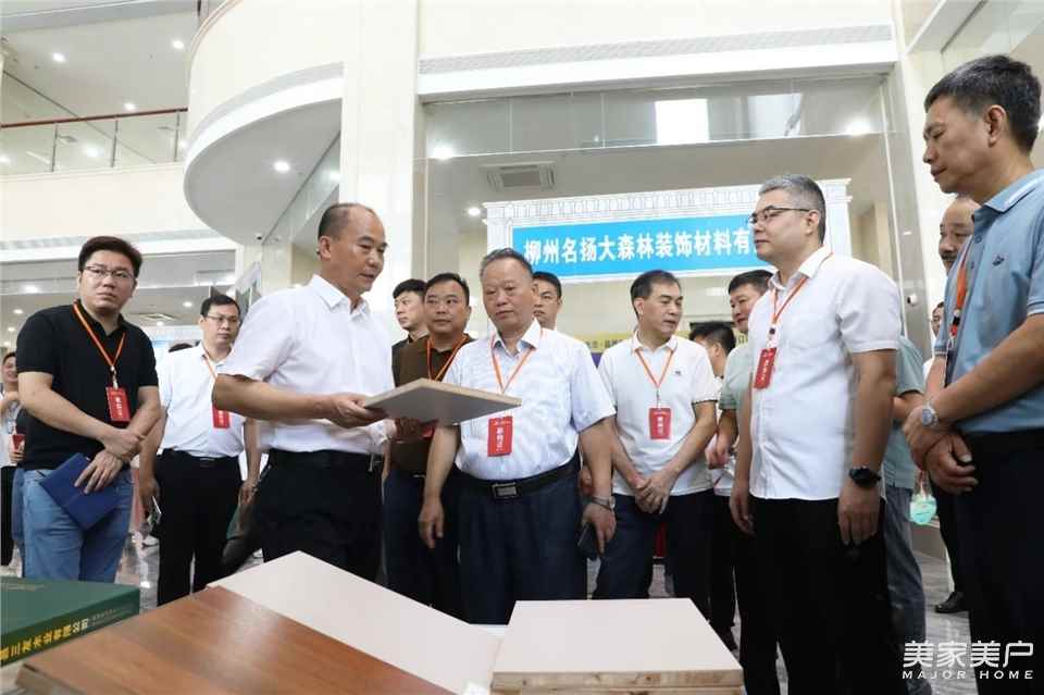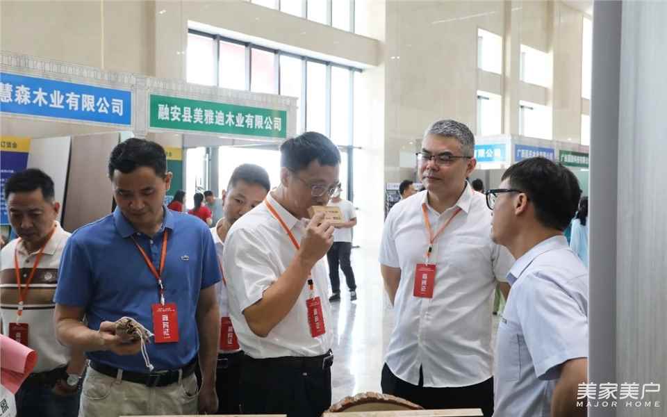 6月29日,在首届柳州(融安)香杉板材订货会现场,柳州市人民政府党组成员袁东升(中)参观展厅。(覃嘉鑫 摄)