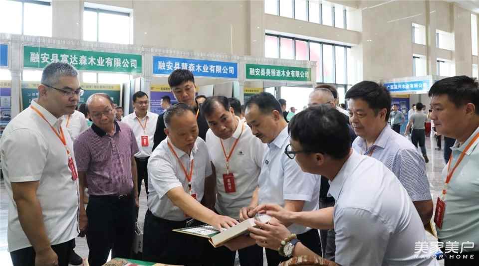 6月29日拍摄的首届柳州(融安)香杉板材订货会现场,领导和嘉宾参观展厅。(覃嘉鑫 摄)