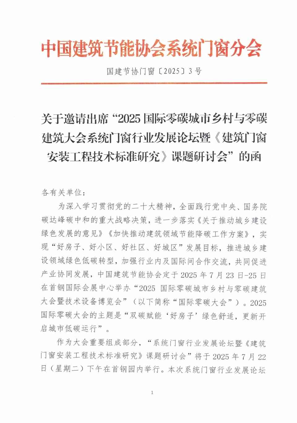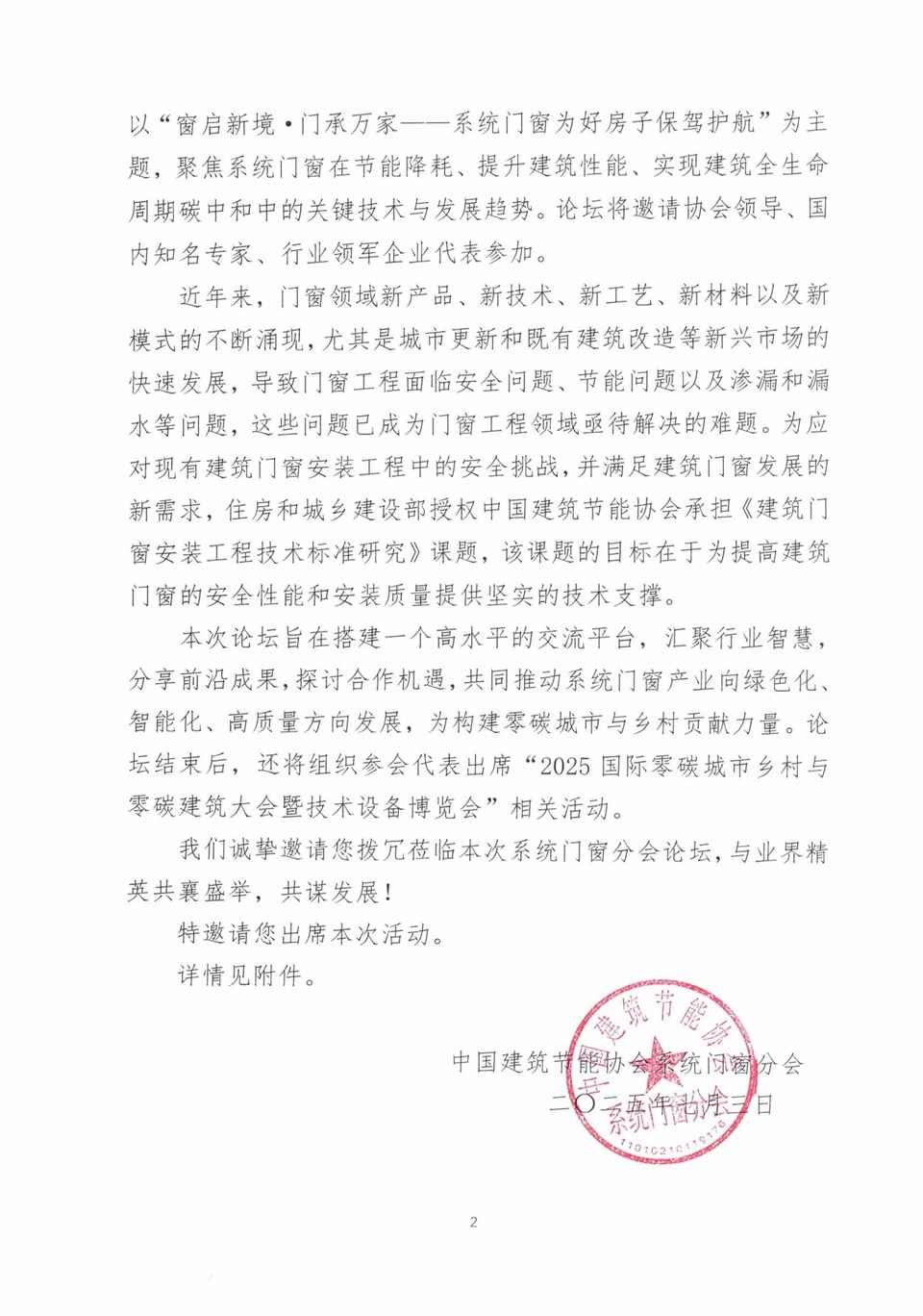 关于邀请出席“2025国际零碳城市乡村与零碳 建筑大会系统门窗行业发展论坛暨《建筑门窗 安装工程技术标准研究》课题研讨会”的函