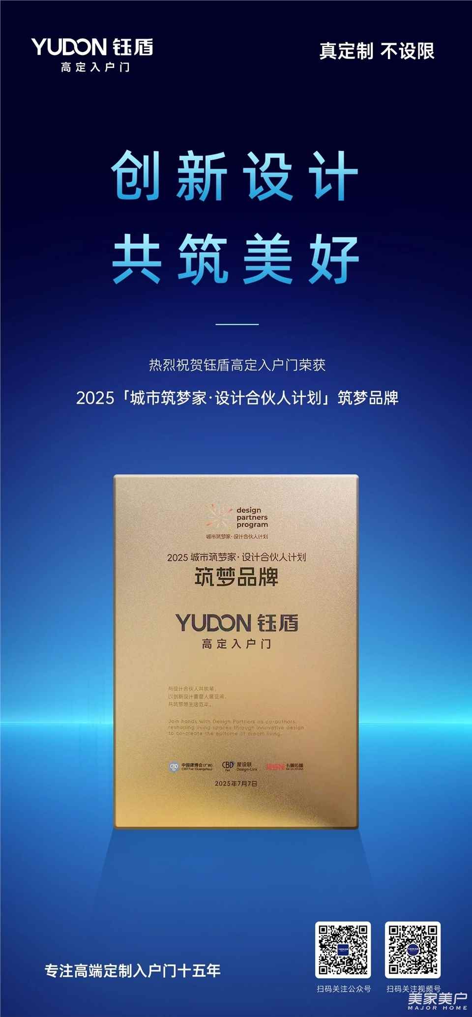 在中国建博会发起的「城市筑梦家」年度颁奖盛宴上,钰盾高定入户门凭借创新的设计与非凡的实力,荣获设计合伙人计划【筑梦品牌】称号。这不仅是对钰盾品牌实力的至高认可,也为入户门行业树立了创新标杆,更是对其引领未来入户门设计创新、共筑城市梦想家园的强力背书。