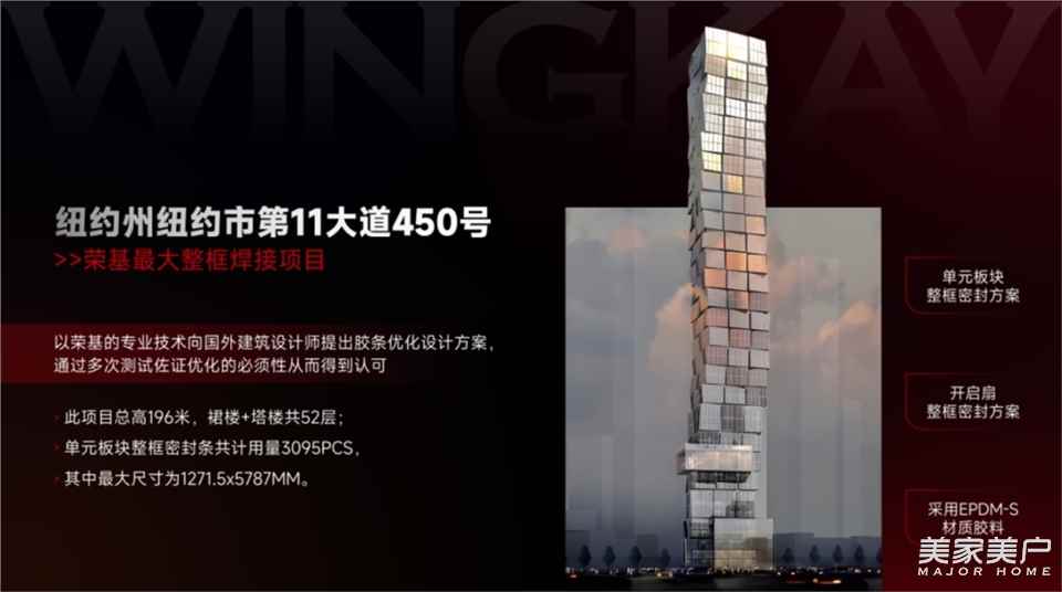 纽约州纽约市第 11 大道 450 号项目为荣基最大整框焊接项目。该项目总高196米,裙楼+塔楼共52层,单元板块整框密封条共计用量 3095PCS,其中最大尺寸为1271.5x5787MM。荣基以专业技术,向国外建筑设计师提出胶条优化设计方案,通过多次测试佐证优化的必须性,得到项目方的认可。