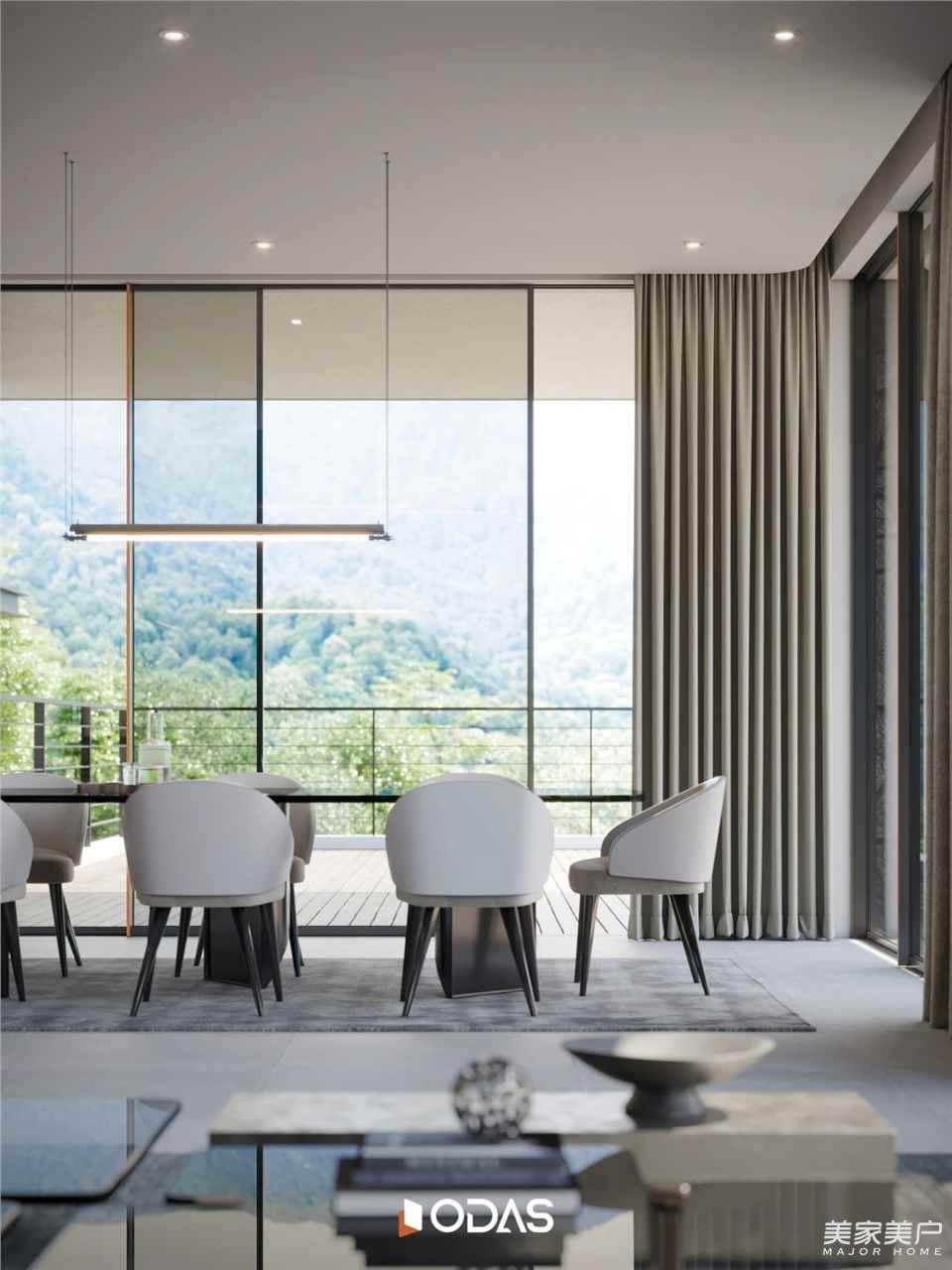 美好生活,是向阳而生,向心而居,更是情感的共鸣。设计首先要让人们感受到光。别墅私邸充分利用周边的自然景观,通过大面积的玻璃幕墙窗将山景引入室内。这种外墙设计核心在于缩减门窗框架的视觉占比,以减轻建筑的沉重感。让更多的自然光线与户外景致涌入室内,体现人与自然和谐共生的设计理念。