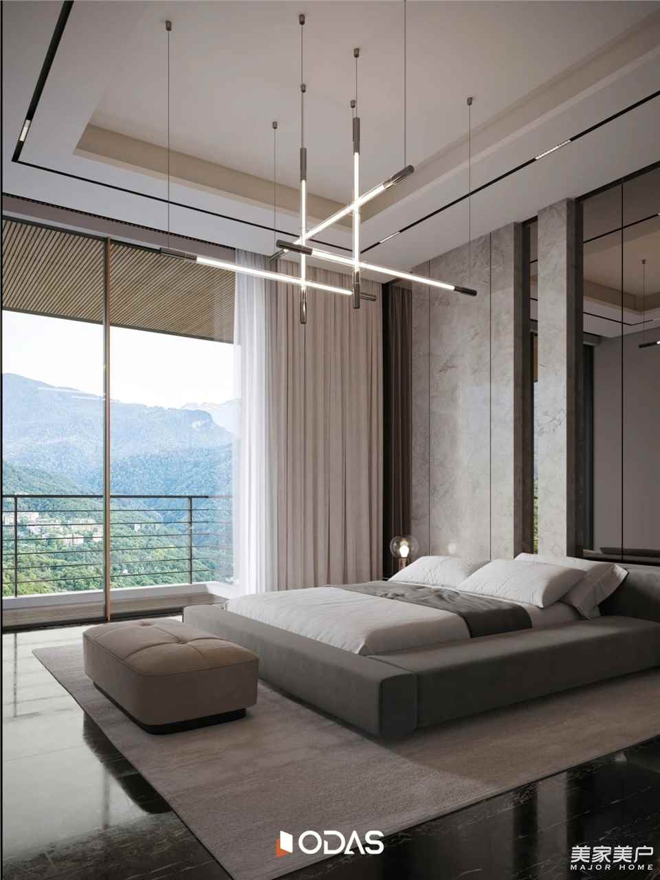 项目主卧室的设计展现出一种朴素、温馨、轻松、谦逊又充满内在智慧的优雅气质。注重私密性和舒适度,引入窗外美景,将大自然的包容性与家庭的温馨氛围完美交融。