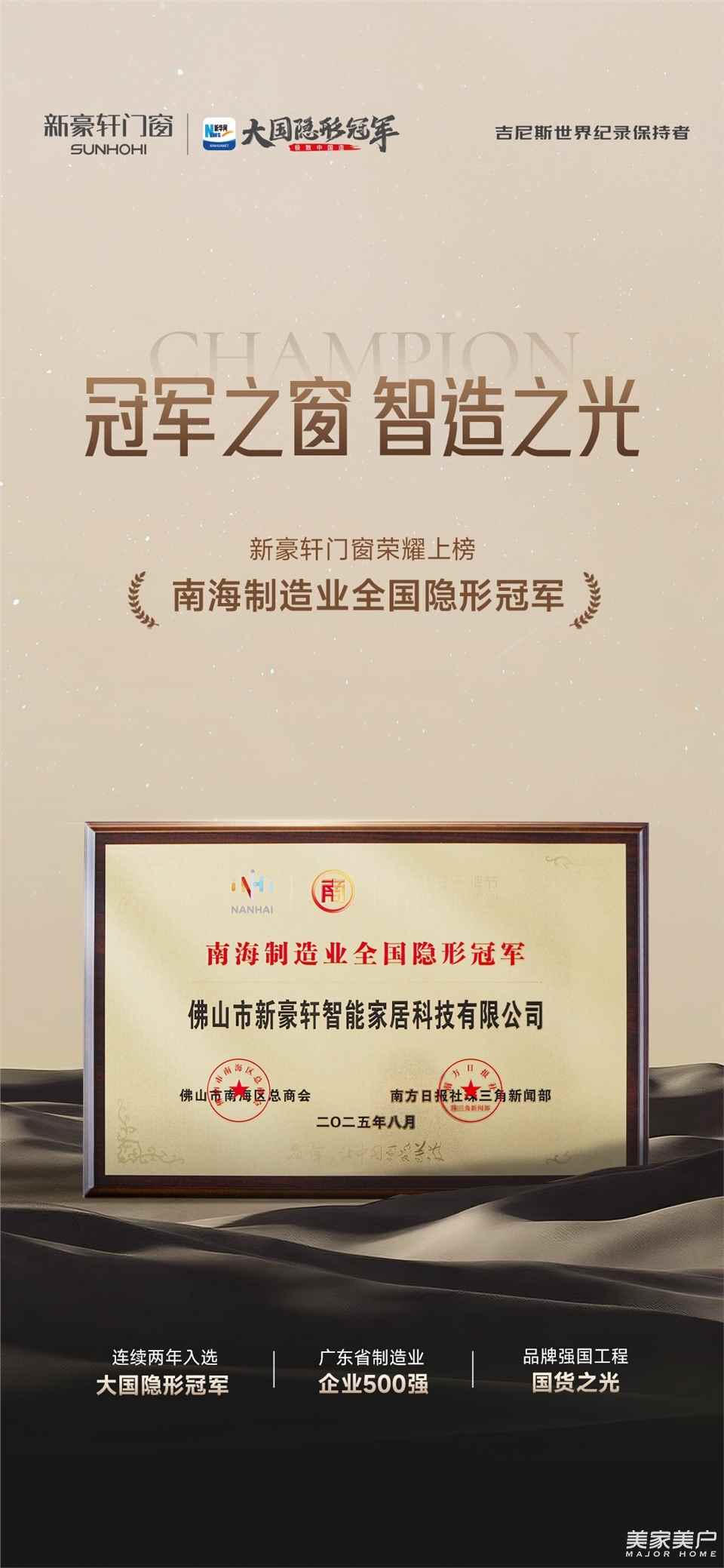 隐形冠军+1丨新豪轩门窗荣登“南海制造业全国隐形冠军”,铸就行业新质生产力标杆