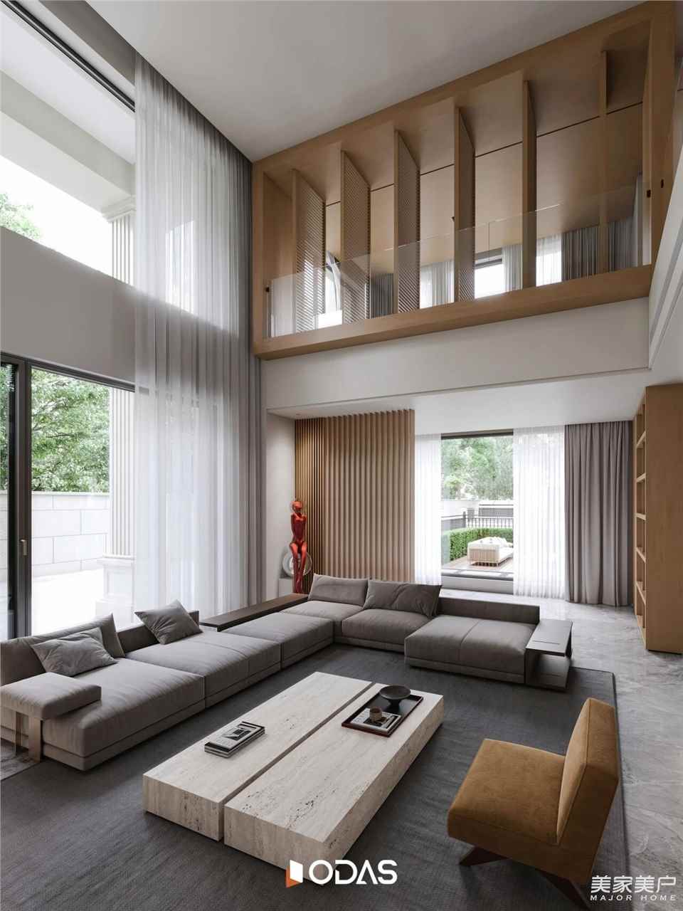 步入客厅,面向庭院的空间豁然开朗,温暖明亮。二层固定玻璃投下的光影像琴键般弹奏出优雅旋律,无论是家庭团聚还是招待宾客,这里都温柔包裹着回家的人。超大落地窗将室外景色“嵌”进室内,让空间成为风景的延伸,让自然持续参与家的塑造。
