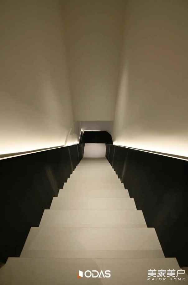 抵达楼梯尽头的转角,眼前这条通透的走廊,便是二层 “空中阁楼” 的序章。脚下与身旁的材质:不再是一层温润的原木与粗犷的石材,取而代之的是带有细腻光泽的金属线条、清透的玻璃与精密板材。