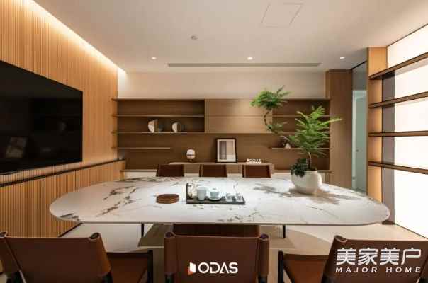 在欧大师泉州健康人居艺术馆的「洽谈体验区」,结合商务会议、VIP洽谈、休闲茶室等体验功能。洽谈区是整个自然峡谷的“核心”,一个被清透玻璃和原始石材包裹的沉思之所。