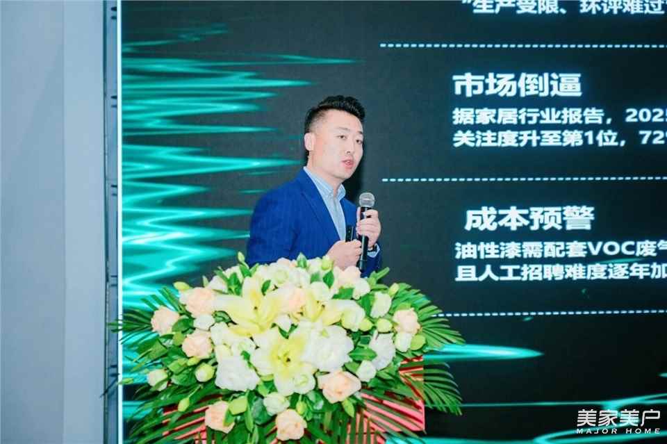 在峰会的主题分享环节,君子兰涂料集团总经理王海军围绕“水漆技术如何助力重庆定制家居迈向绿色新时代”展开深度演讲。他指出,在国家“双碳”目标与消费者健康需求升级的双重驱动下,水漆替代传统油性漆已成为家居产业转型的必然趋势。君子兰漆凭借多年技术积累,不断为定制家居企业提供高品质环保涂料产品和定制化涂装解决方案,帮助企业提升,同时满足多样化的色彩装饰需求。此外,王海军还分享了君子兰漆在产业链协同中的实践经验,强调“单一企业的技术突破不足以推动行业变革,唯有上下游企业深度联动,才能构建真正的水漆定制生态圈”。