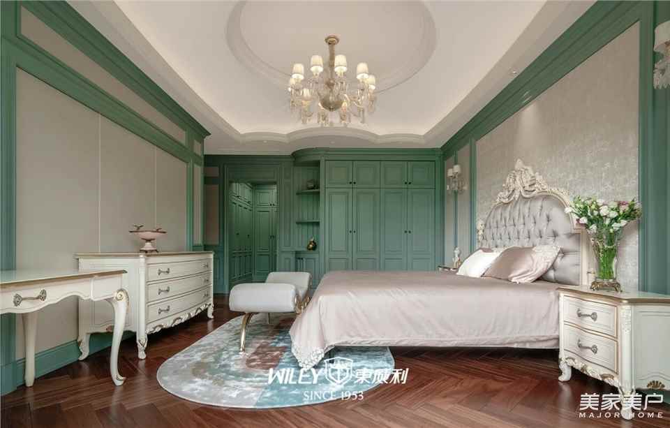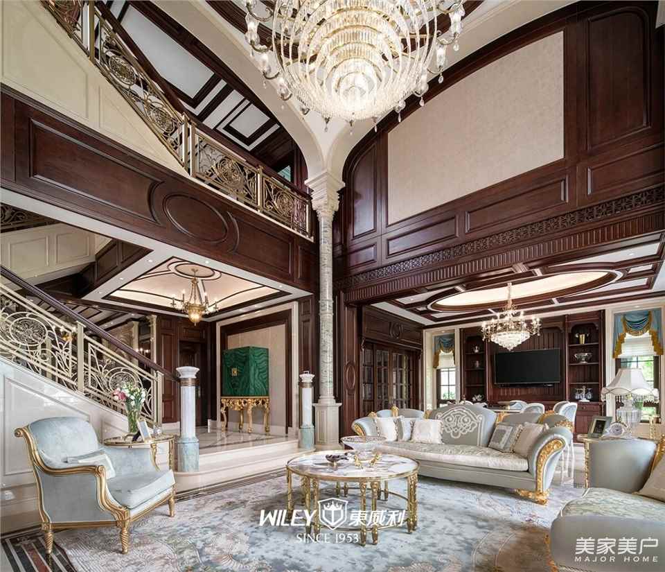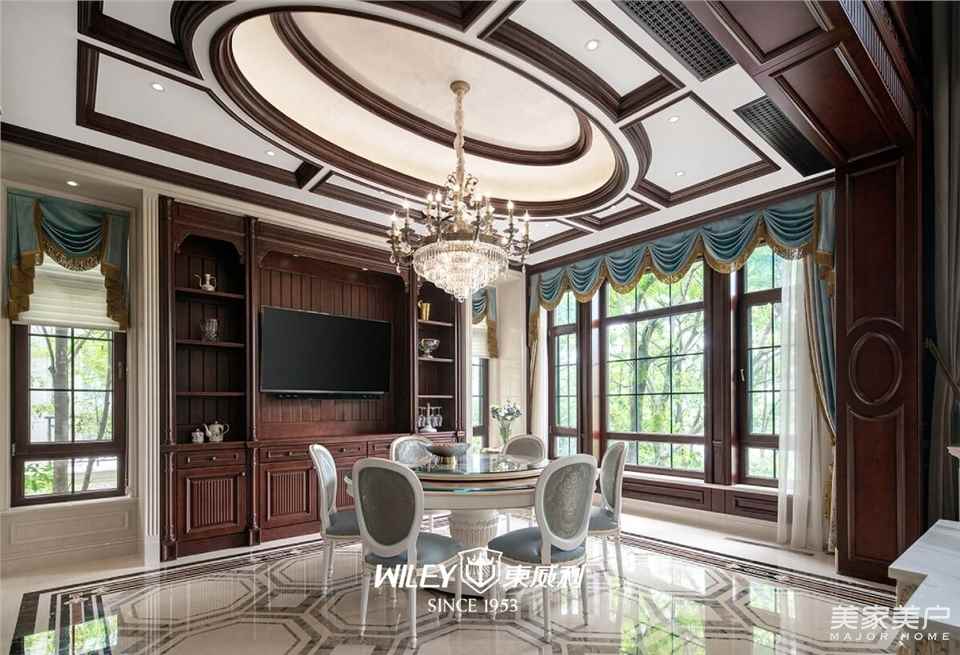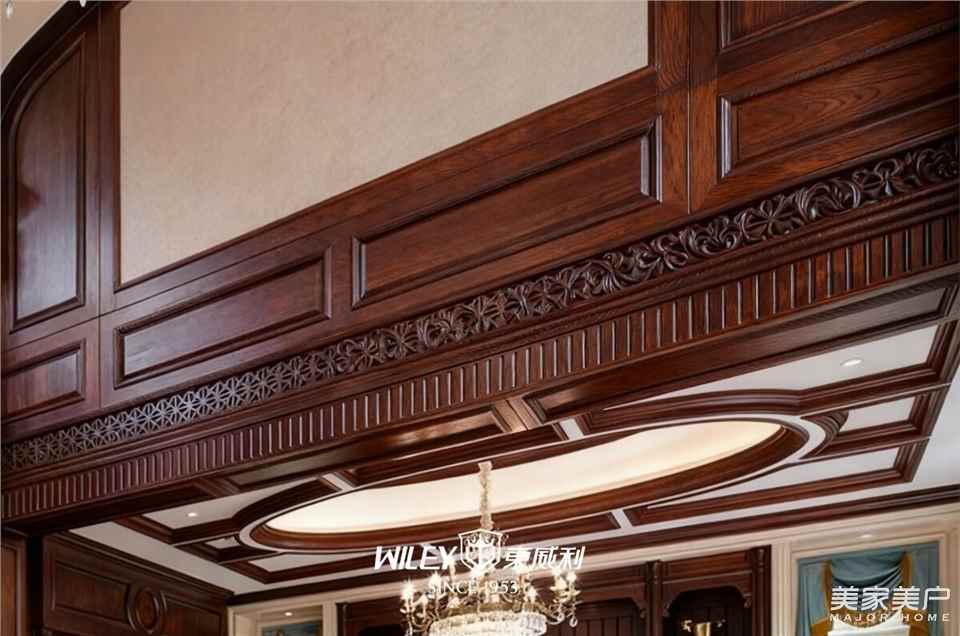 吊顶中心花融合巴洛克繁复与新古典雅致,每片叶瓣由手工反复雕琢,近看精致,是匠人数十年功底赋予木材的生命张力。