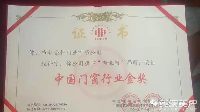 2017年1月11日,“2016中国门窗幕墙行业年会”在首都人民大会堂隆重举行!佛山市新豪轩门业有限公司荣获“中国门窗行业金奖”!