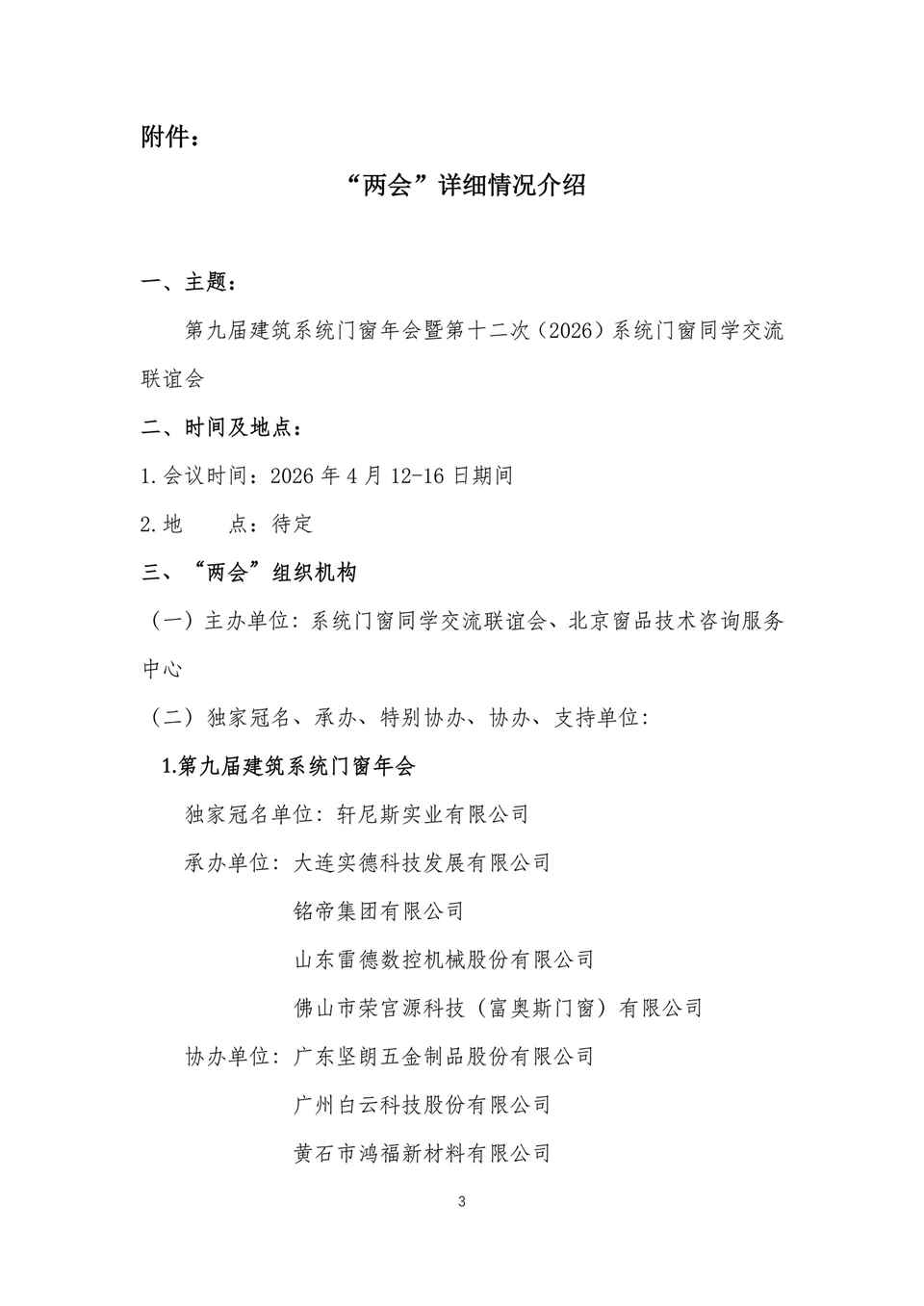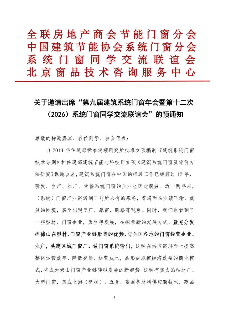 关于邀请出席“第九届建筑系统门窗年会暨第十二次 (2026)系统门窗同学交流联谊会”的预通知