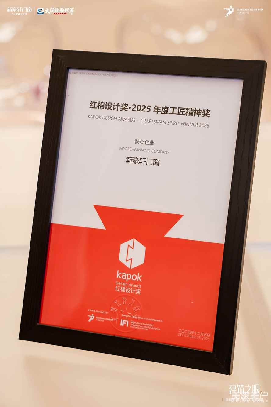 12月7日上午,“红棉设计奖2025至尊论坛暨室内设计颁奖典礼”活动现场,新豪轩门窗营销总经理晁岳亮作为品牌代表,以特约合作伙伴身份登台致辞,分享新豪轩门窗在推动家居设计与服务升级方面的实践与思考。同时作为颁奖嘉宾,品牌方代表给获奖设计师代表颁奖,诠释新豪轩与设计师深度协同、赋能美好生活的价值追求。同日下午,在“红棉设计奖2025至尊论坛暨产品设计奖颁奖典礼”上,新豪轩门窗更凭借精益求精的匠心精神与行业引领作用,荣获“红棉设计奖·2025工匠精神奖”,再次收获行业高度认可。