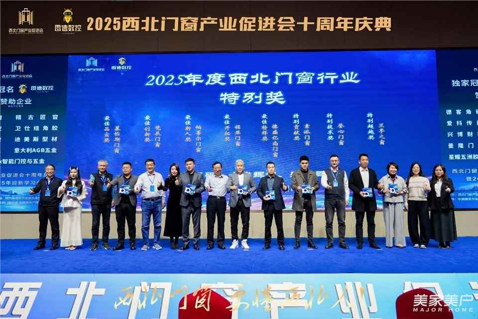 随后,孟繁军副会长、邓小鸥主任、刘军副总工、胡宝升主任、王盛坤副总工、高文红副会长和姚丽春秘书长受邀上台为2025西北门窗行业优秀者颁发特别奖。刘副总工和邓主任为首届西北门窗实景安装大赛和第二届性能实测大赛优胜者颁发了奖杯。