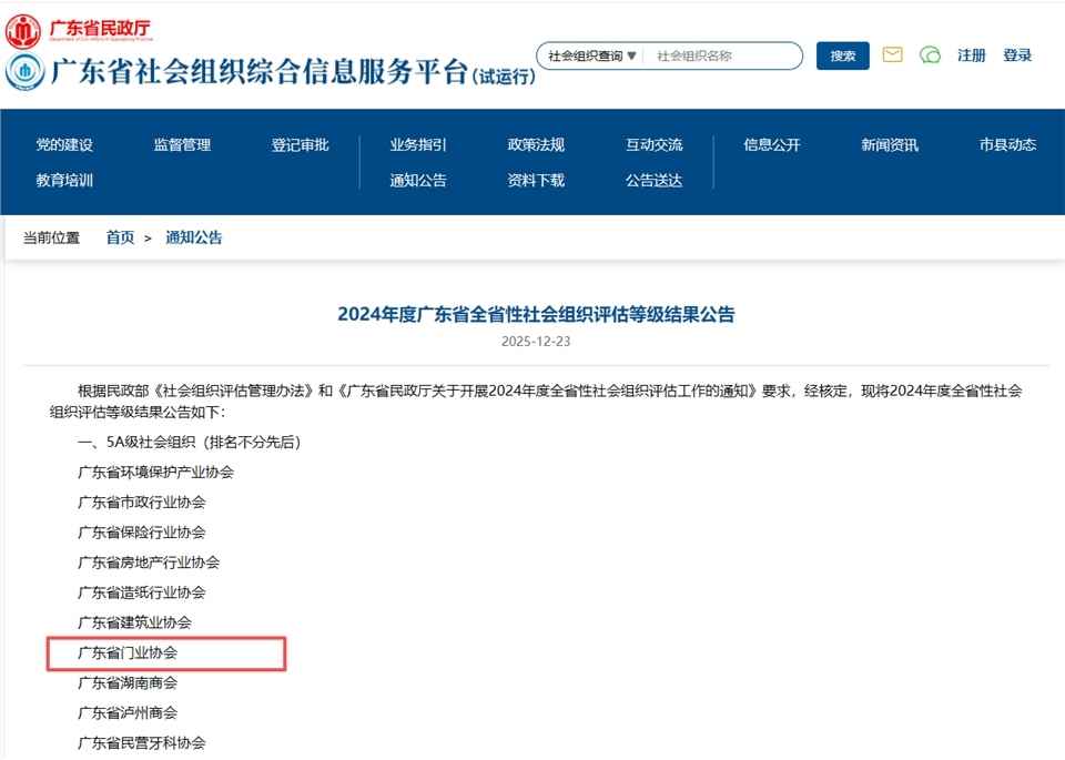 近日,根据《社会组织评估管理办法》《广东省民政厅关于开展2024年度全省性社会组织评估工作的通知》等要求,经广东省全省性社会组织评估委员会审议,广东省门业协会凭借在党建引领、内部治理、行业赋能和社会服务等方面的卓越表现,成功获评“5A级社会组织”——广东省社会组织评估的最高等级荣誉。这一结果标志着广东省门业协会在规范化建设、服务效能和行业影响力等方面获得政府与社会的高度认可。
