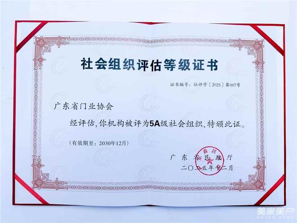 此次获评“广东省5A级社会组织”,既是对协会过往工作的权威肯定,更是行业赋予协会的责任使命。未来,广东省门业协会将以5A评级为新的起点,持续深化标准化建设,探索数字化转型服务模式,推动产业链协同创新,助力广东门业集群向“高端化、品牌化、绿色化”迈进,为打造全国门窗产业标杆贡献力量。