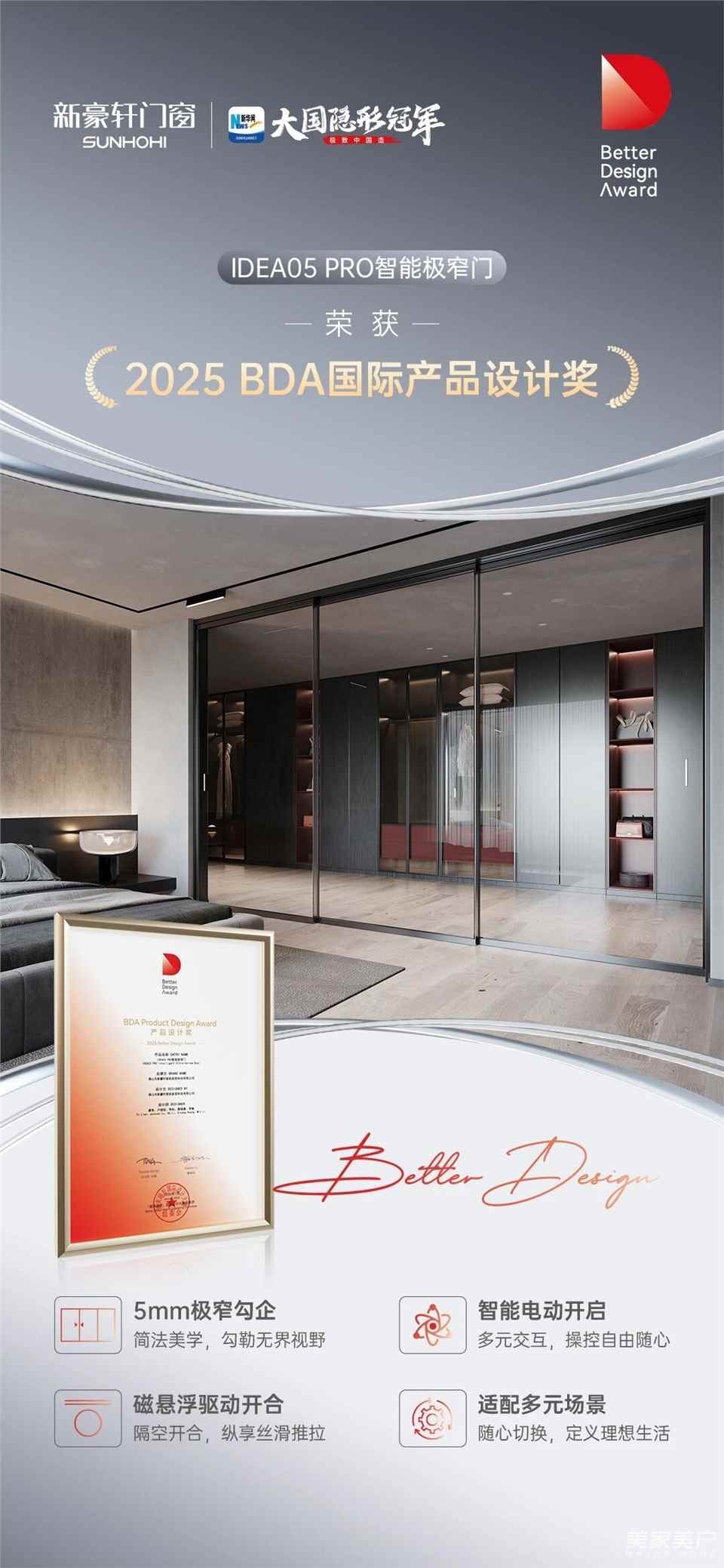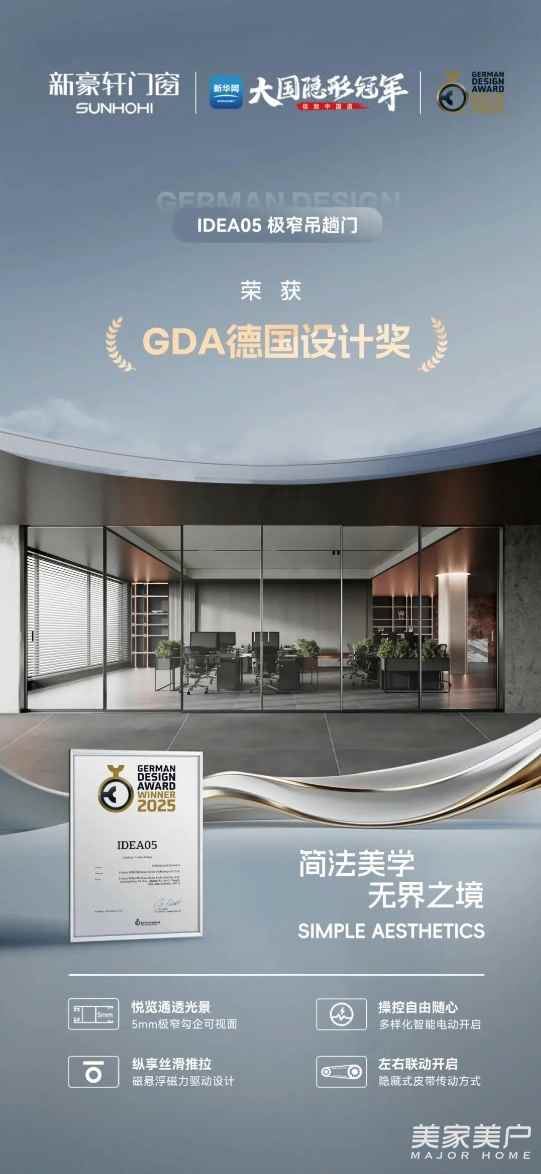 在本次高规格、高水准的国际设计盛会上,新豪轩门窗IDEA05 PRO智能极窄门,凭借卓越的设计理念与创新实力,荣膺大赛“产品设计奖”。新豪轩门窗也是中国门窗行业首家获此殊荣的品牌。这不仅是对该产品卓越工业设计的高度认可,更是对新豪轩门窗以创新设计提升人居生活品质理念的褒奖,标志着企业在技术创新与市场应用取得成功的基础上,于设计美学领域同样获得了国家级权威赛事的重要肯定。
