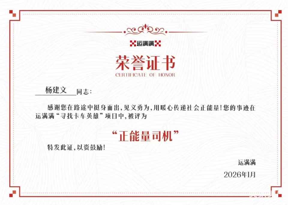 1月19日,运满满正式授予杨建文“卡车英雄·正能量司机”称号,颁发荣誉证书、感谢信和奖金,致敬其以干线侠义,锻造公路脊梁。
