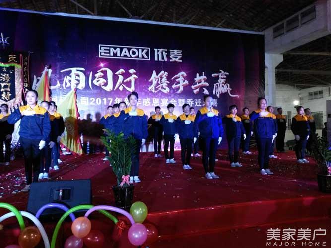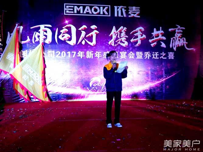 2017年1月14日晚,创优公司2017年新年感恩宴会暨乔迁之喜晚会在佛山依麦滑轮五金系统工业园。晚会以“风雨同行 携手共赢”为主题,依麦总经理麦兆聪在致辞时表示,依麦2016年发展势头强劲,公司整体面貌发生巨大改变。厂房从不足1000平方米发展到5000平方米,员工人数翻了两倍,内部组织架构逐步完善,员工福利不断提升,这都离不开依麦家人们的努力和嘉宾们的关心。饮水思源,知恩图报,2017年,站在崭新的起点,他希望依麦家人以饱满的热情,积极的态度迎接2017。