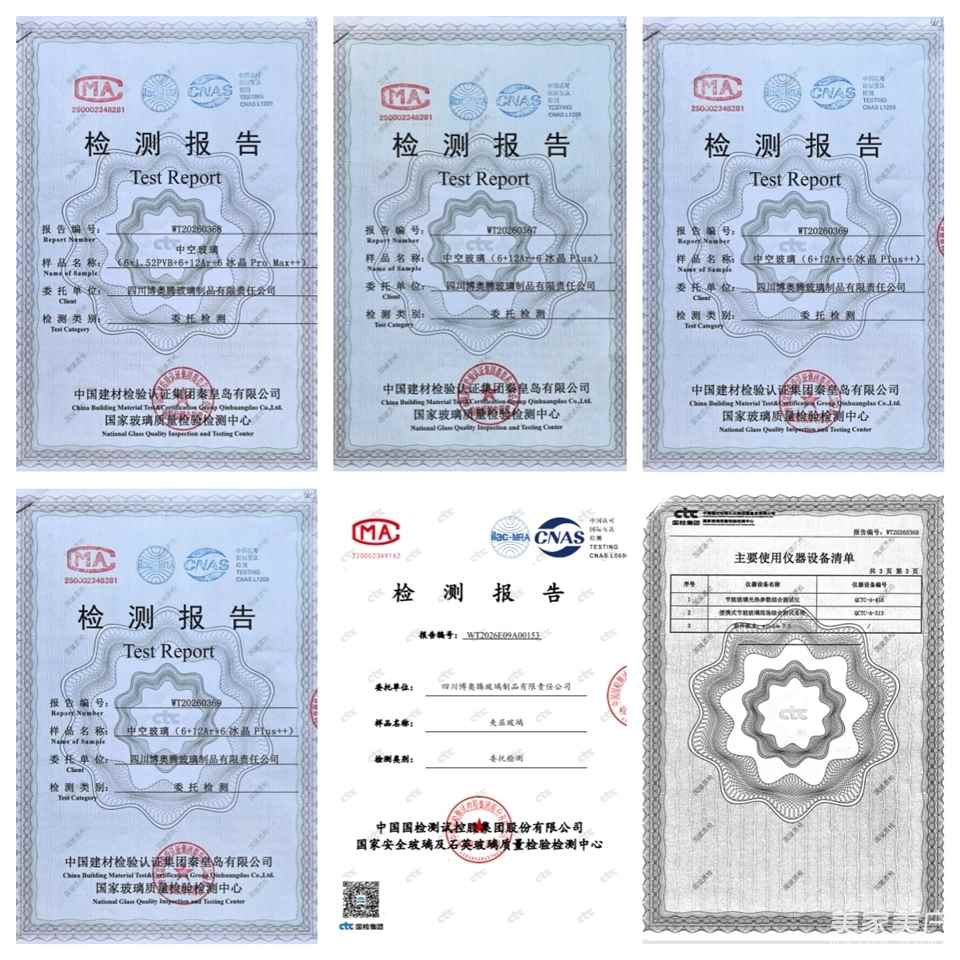 目前,博奥腾冰晶超能玻璃系列,包括6+12Ar+6冰晶Plus++、6+12Ar+6冰晶Plus、夹层玻璃等多款产品,均已通过国家玻璃质量检验检测中心的严格检测。报告显示,其各项关键性能指标均远超国家标准,以过硬的品质获得了国家级权威认可。