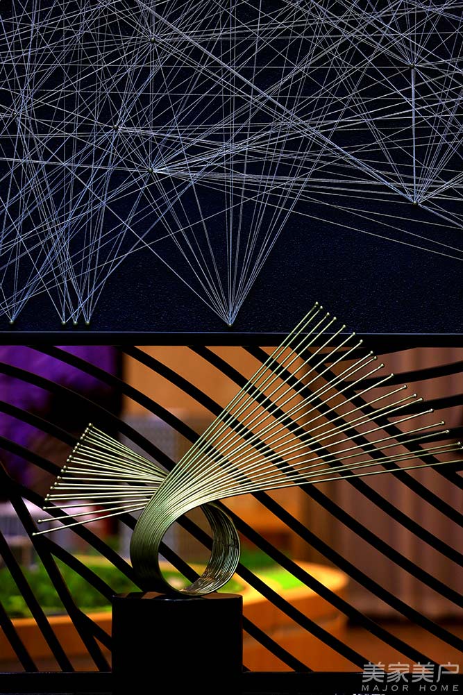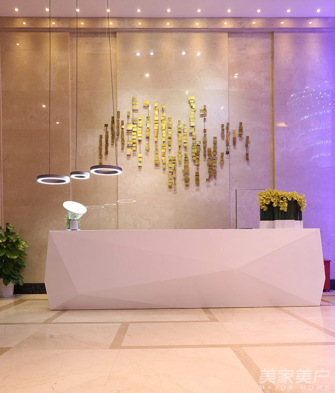 在营销中心大堂的设计中背景墙占据着主角,洒金金属片以充满动感的双行交错,创造天空的乐章;亚克力背景墙从功能到景致,带动着整个空间的氛围,用光与影的结合,让每位来客都融入到设计所精心规划的美丽构图中。