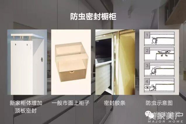 新家通过调研及实验发现,只要防止潮湿并切断食物来源,可以有效实现防虫。对此,我们做了两项工作:1橱柜的密封处理,2环境的干燥设计。