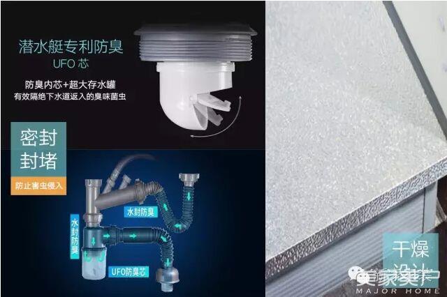 2.环境的干燥设计:尤其是水槽下方的环境,我们通过铺贴防潮锡纸保证干燥。同时将原来标配的普通下水管更替为潜水艇品牌(不要吃惊,就是鸟巢、水立方和世博会场馆也在用的那个大牌)下水管--超强性能的硅胶密封塞及密封垫圈设计不仅起到防臭防漏水的作用,也能有效防止邻居家的蟑螂暗渡陈仓到你家来。