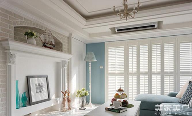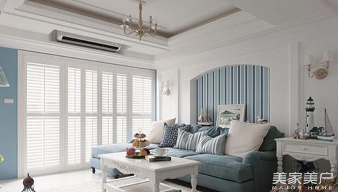 整体就以蓝白色调装饰起来的客厅,清澈无瑕,诠释着人们对蓝天白云,碧海银沙的无尽渴望。整体上以白色为色调的墙面配上蓝色的布艺沙发,蓝白色调的搭配,如同迎面吹来了一股清新自然的海洋之风。客厅装上白色的百叶窗,户外光线洒入室内时,更显居家高雅气氛。