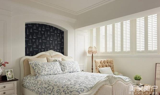 白色带有曲线线条加上简单雕刻配上米色的大床看上去舒适而温馨,床背以拱门式的玄关设计配上简单描绘的帆船的壁画,使整体在舒心雅致的同时又带着海洋自由的元素。白色的百叶窗将室内地面材料和天花墙更好地进行搭配,能让室内看起来更清新,更宽阔。