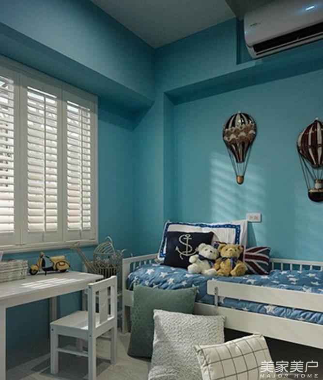 以蓝白色调配置起来的卧室,看上去如同正置身于蓝天碧海之间,墙上挂置的暖气求样的图画,就如同正在海边乘着热气球俯瞰着这大海沙滩的美景。