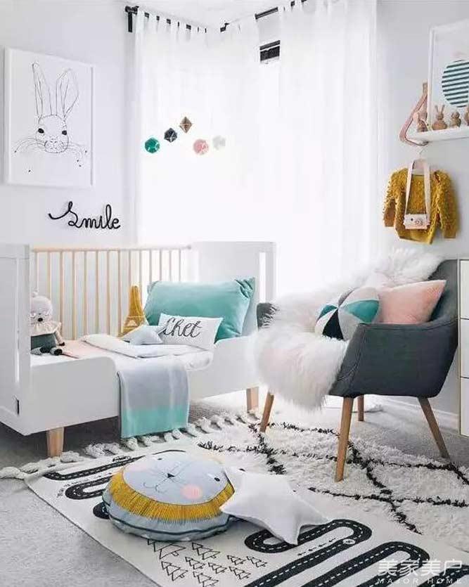 天花板的装饰越简单越好,颜色要统一。过于混杂浮夸的颜色或造型装修,孩子躺在床上时或者夜晚醒来时会觉得害怕。