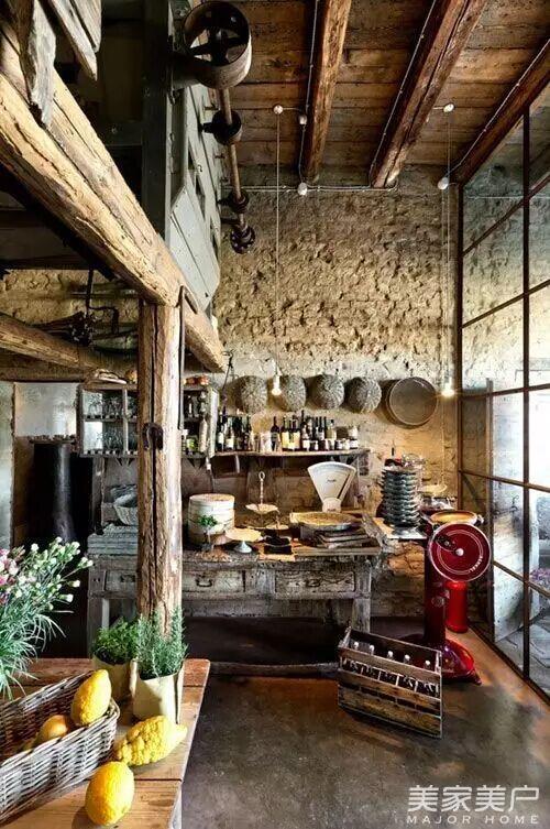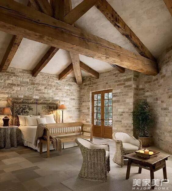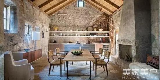 石头墙壁的自然质朴,与家具的精致细腻相互映衬。色彩也变得更加艳丽动人,形成一种不同寻常的氛围。